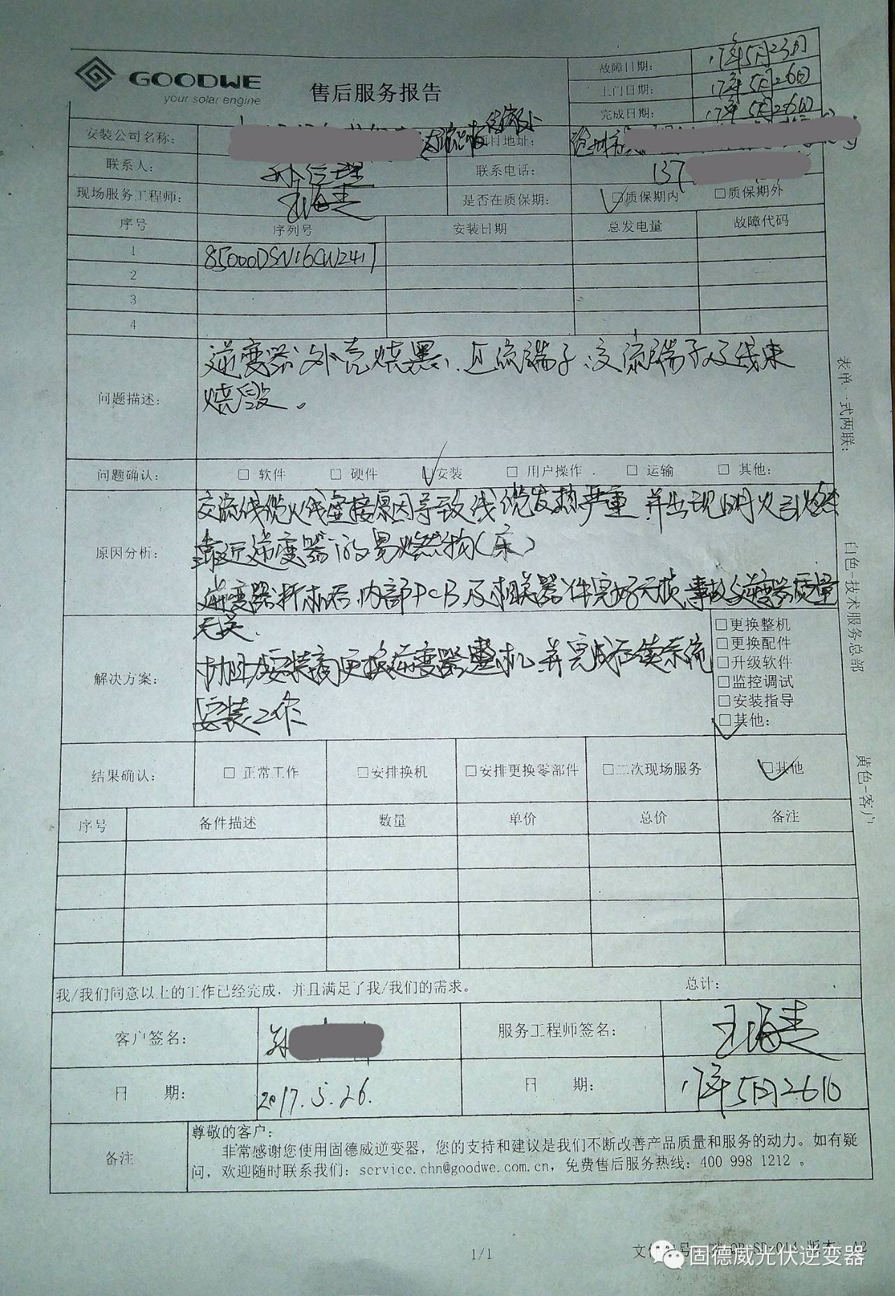 对于此次事件,固德威遗憾的是:事故发生于5月23号中午,但是我们的售后团队5月26号才收到相关的故障反馈,未能第一时间赶到现场帮助业主处理问题。其实,固德威已经建立了十分健全的售后服务体系,在全国范围内设有8个办事处,本次事件从收到通知到赶至现场,仅用了5个多小时,致力于为全球客户提供可靠高效的售后服务,创造更多价值。所以,如果您遇到任何问题,请第一时间拔打我们的免费售后服务热线:400-998-1212,我们的工作时间是:8:00-18:00,全年无休!