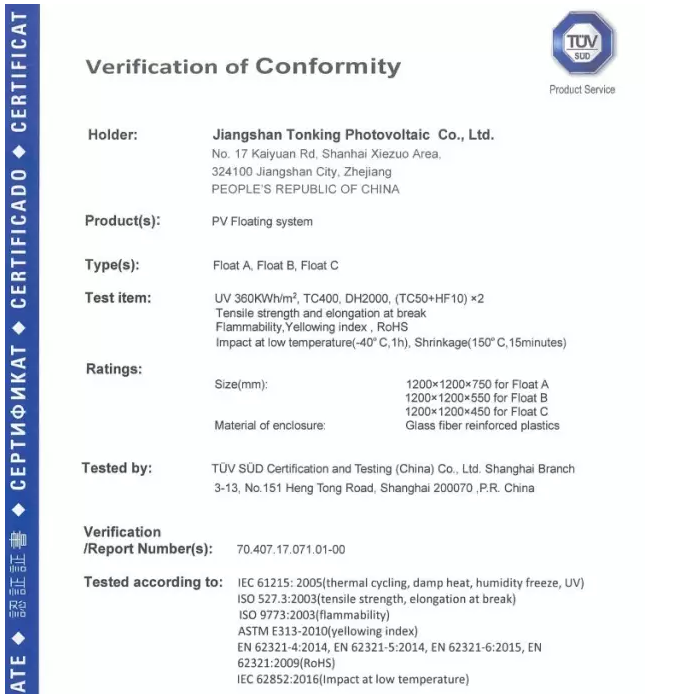 近日,全球水面漂浮支架系统解决方案领导者——同景新能源(08326.HK)水上漂浮浮筒顺利通过全球领先的第三方检测认证机构TÜV南德意志集团(以下简称“TÜV SÜD”)的认证,并颁发证书。经过三个多月的严格测试,TÜV SÜD对同景的玻璃钢浮筒进行了全面系统的评估,评估内容包含了材料耐候性、机械性能,阻燃性能以及环保要求等。通过评估,同景新能源成为全国首家获得TÜV SÜD水面光伏支架系统认证的供应商。