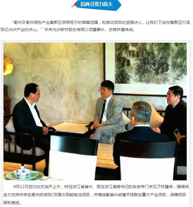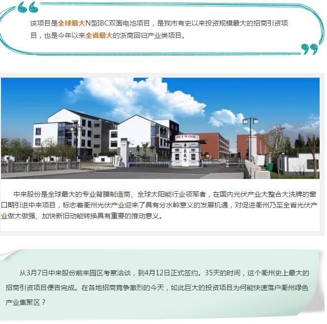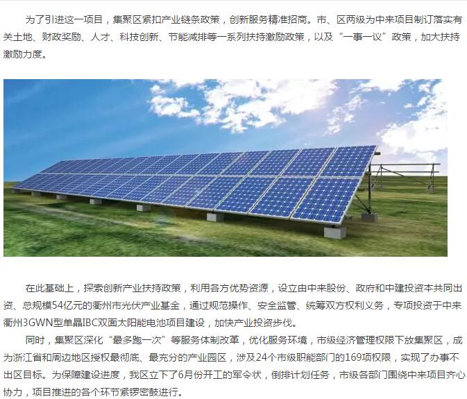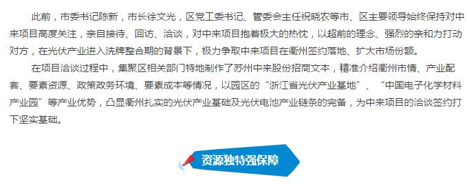 衢州集聚区与苏州中来35天敲定总投资200亿元项目