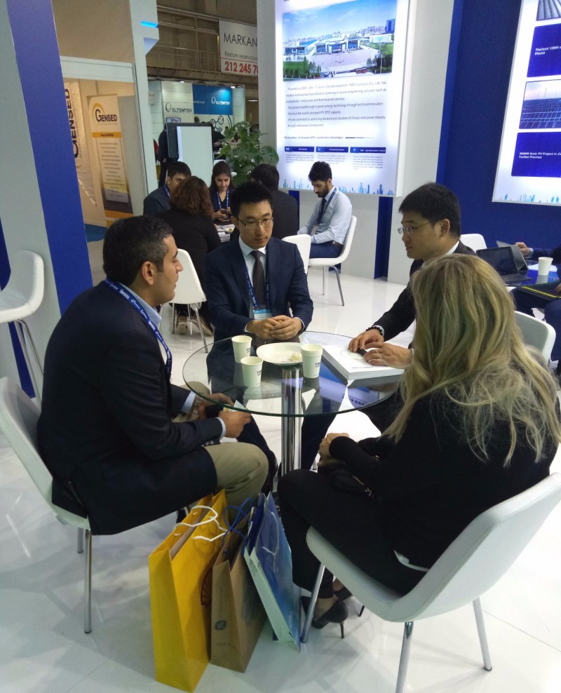 在特变电工新能源公司总经理助理赵荣的带领下,公司团队与来访客户进行了深入的交流和洽谈,重点对土耳其及其周边国家乌克兰,埃及的风电光伏项目机会进行了挖掘。展会期间,土耳其能源部等政府机构和战略客户莅临了特变电工新能源公司展位,就当地重要光伏风电项目进行了交流。