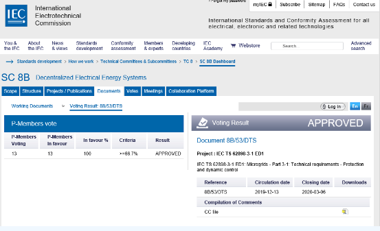 近日,由新疆金风科技股份有限公司(下称“金风科技”)全资子公司北京天诚同创电气有限公司(下称“天诚同创”)提出并牵头制定的国际标准《微电网 第3-1部分:技术规范-保护和动态控制》(下称IEC TS 62898-3-1)获国际电工委员会分布式电力能源系统分技术委员会(下称IEC/SC8B)以100%的赞成票率批准通过,预计将于2020年11月正式发布。
