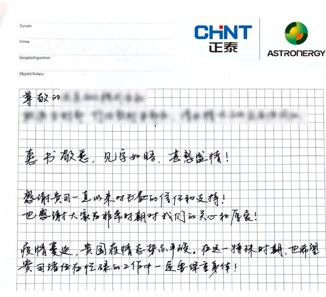 信中,日本客户对陆川总裁及正泰新能源表示慰问,期盼新的业务合作,并祝愿早日度过疫情。那一行行工整的中文,情真意切,如春日暖阳,照人心弦。