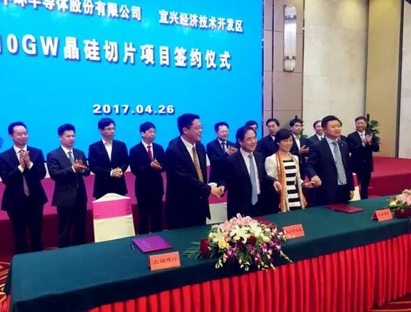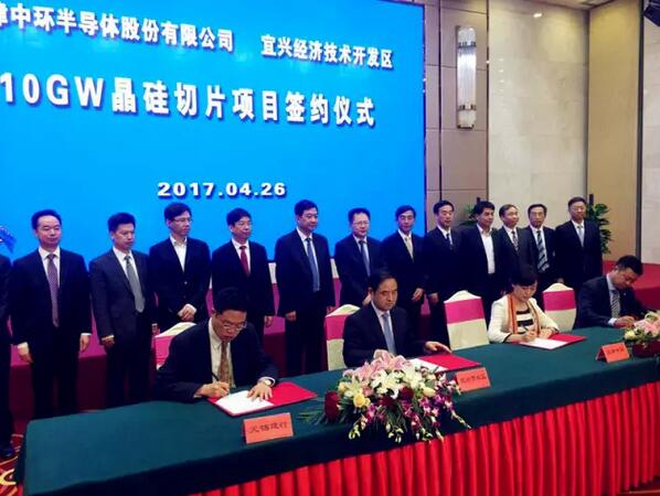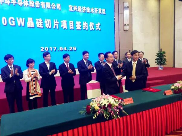 4月26日,中环股份与宜兴开发区本着“优势互补、务实高效、共同发展”的原则,签署10GW高效太阳能电池用超薄硅单晶金刚线切片产业化项目合作协议。无锡市市委副书记、市长汪泉,宜兴市市委书记沈建,宜兴市市长张立军,中环电子集团党委书记、董事长曲德福,中环电子集团党委副书记、总经理、中环股份董事长、总经理沈浩平等领导见证了本次签约活动。该项目总投资额30亿元,投产后单晶硅切片产能将达到10GW,并实现零排放,践行社会责任,提升行业发展水平。