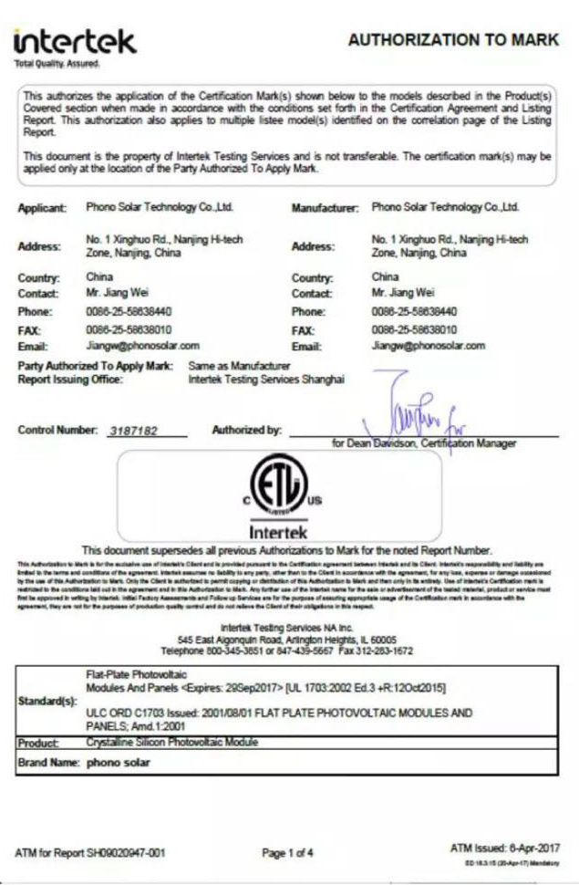 近日,苏美达辉伦(Phono Solar)组件接连获得世界权威认证机构——ETL的光伏产品最新认证证书。本次证书增加了苏美达辉伦(Phono Solar)越南基地生产的单、多晶5栅线电池片、单晶Perc5栅线电池片等产品。据了解,任何电气、机械或机电产品只要带有ETL标志就表明此产品已经达到经普遍认可的美国及加拿大产品安全标准的要求,它已经过测试符合相关的产品安全标准。该证书的获得,不仅标志着从此越南基地发货的苏美达辉伦(Phono Solar)光伏组件今后销往北美市场将畅通无阻,更意味着苏美达辉伦(Phono Solar)产品的优异性能得到世界著名第三方认证机构的肯定。