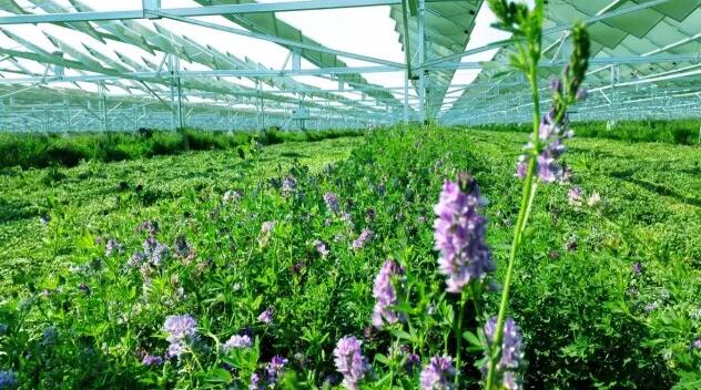 宝丰二期项目采用同景自主研发的斜单轴跟踪支架系统。支架结构让组件排布受风面积小,提高了支架系统的整体抗风能力,完全适应西北地区风沙大的气候和环境特性。同时,架空距地面2米以上,每排立柱间距达8米,确保农作物生长所需光照,并为大型农机作业提供充裕的空间。整体跟踪支架的结构设计便于日常维护、大大降低了建设成本。
