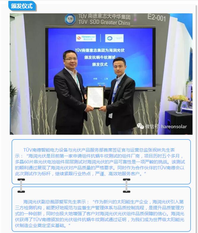 4月20日,全球领先的第三方检测认证机构TÜV南德意志集团(以下简称“TÜV南德”)在上海第11届国际太阳能光伏展览(SENC 2017)TÜV南德展台上为海润光伏科技股份有限公司(以下简称“海润光伏”)多晶60片串光伏电池组件授予其通过抗蜗牛纹测试证明。该测试的通过充分体现了海润光伏组件的优异品质,以及其产业链的产品可靠性承诺。TÜV南德智能电力设备与光伏产品服务部首席签证官与运营总监张祝林先生、海润光伏副总裁邵爱军先生出席了该颁证仪式。