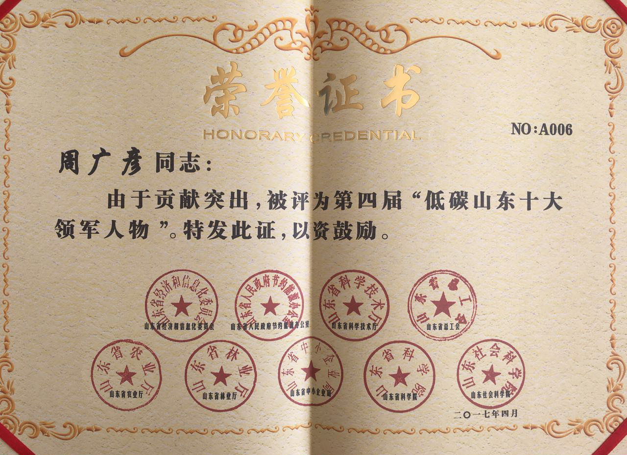 力诺电力集团董事长总经理周广彦荣获“低碳山东十大领军人物”称号