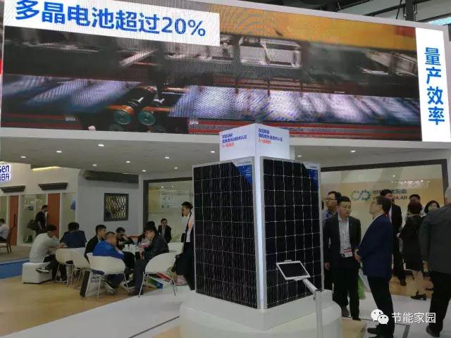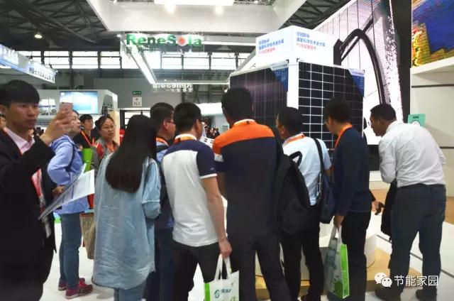 本次中节能太阳能镇江公司展台最引人瞩目的莫过于两座旋转组件台,展示台展示的两件产品分别为荣获“国家科学技术进步奖”的PVB双玻组件和鉴衡“领跑者”先进技术认证A+级产品PERC多晶组件。PVB双玻组件是中节能太阳能镇江的特色产品,采用PVB胶膜,较EVA及POE胶膜使用寿更长,使用范围更广,其耐候性,稳定性,安全性都较EVA及POE胶膜更高,同时其低透水率,高抗冲击力,高可靠性也优异于EVA及POE胶膜,中节能太阳能镇江公司是行业内首家PVB量产的企业,中节能太阳能镇江的双玻组件可做到载重1000KG无隐裂,且远超30年的使用寿命和0.5%的年衰减率,其发电效益在整个系统生命周期内将比常规组件高出21%,有效降低光伏系统降低成本。获领跑者技术认证A+级产品PERC多晶组件,应用于多晶组件中将助您超跑+3分,包含在重点设备技术先进的评分项中,综合该项,中节能太阳能镇江公司的光伏领跑者A+级产品将能加满10分助您一臂之力。