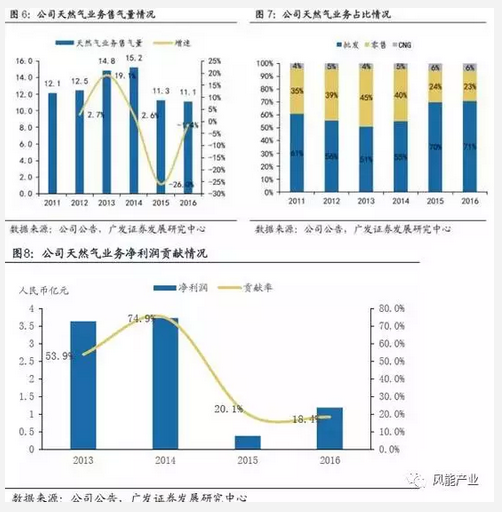近几年来,天然气业务对公司净利润的贡献率持续走低,从2013年的53.9%降到了16年的18.4%,相反,毛利率更高的风电业务对公司净利的贡献率逐年升高。