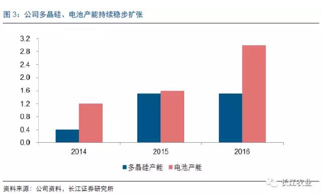 公司作为国内多晶硅龙头企业,是国内七家万吨级多晶企业之一。截止2016年底,公司具备多晶硅产能1.5万吨,2017年通过技改有望进一步扩产至2万吨,产能规模位居国内前三。