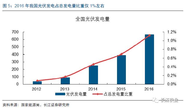 从中期看,在国内环境问题日益严重、对外碳减排承诺等压力下,我国对于新能源发展仍呈明显的支持态度。2016年3月,国家能源局下发《关于建立可再生能源开发利用目标引导制度的指导意见》,明确指数2020年全球非水可再生能源用电占比达到9%以上,且直接考核火电企业。而2016年我国风电、光伏等非水可再生能源发电占总用电比重仅5%左右,光伏发展占比更是仅1%左右。因此,在相关政策支持下,预计后期我国光伏行业仍将维持平稳发展。
