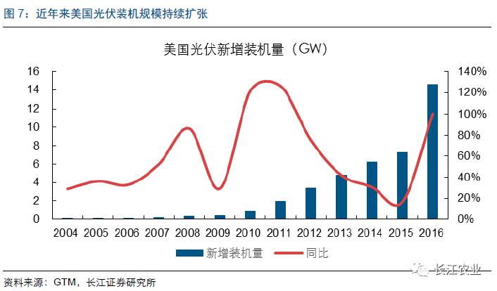 整体来看,我们认为后期全球光伏需求仍将维持稳定增长趋势,预计2017、2018年全球光伏装机有望达到75、80GW,年化增长5%左右。