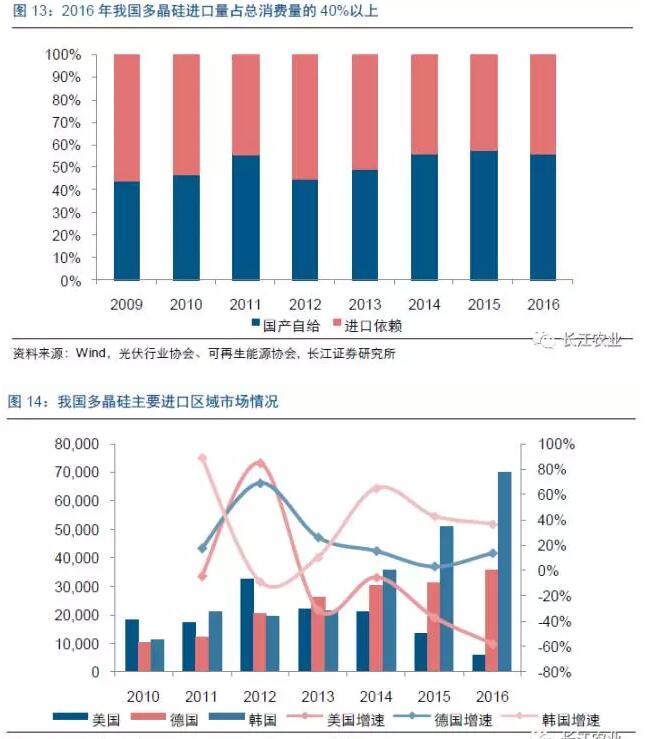 根据海关数据,2016年我国多晶硅进口14.1万吨,同比增长25.67%,进口规模占总消费量的40%以上。其中,从韩国进口7.01万吨,同比增长36.92%;从德国进口3.57万吨,同比增长14.01%。从美国进口0.56万吨,同比减少56.76%。