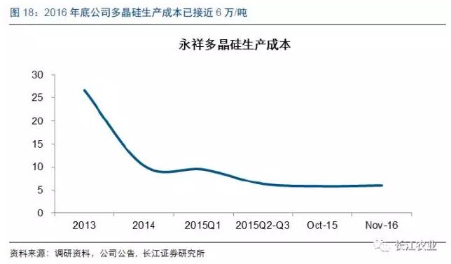 成本方面,公司多晶硅产能布局四川省乐山市,一方面乐山市为我国多晶硅生产发源地,具备完成的工业硅生产产业链,使得公司可以以更低的价格获取原材料;另一方面,四川省水电资源丰富,电价水平较低,从而使得公司在本就较低的综合电耗水平下,获取更低的多晶硅生产电费成本。同时,公司具有完善的精细化管理体系,从细节入手,进一步降低成本。根据公司数据,2016年底公司多晶硅生产成本已降至6万/吨以下水平,处于行业领先水平。