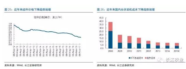 然而,随着光伏产业慢慢进入成熟期,组件价格及电站装机成本下降趋势均有所放缓,且土地、人工等BOS成本未来甚至可能出现一定成本的上涨,尤其是分布式的发展,屋顶及人工成本问题将进一步体现。