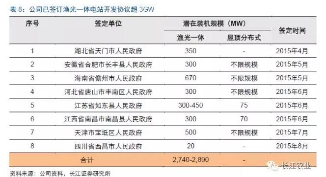 借助这一优势,以及公司在渔业、光伏电站开发两个领域的双重优势,公司积极布局渔光一体光伏电站,抢装资源,推动电站业务规模扩张。根据公司资料,截止2015年,公司已与多个政府签订渔光一体电站开发规划,潜在开发规模超3GW。