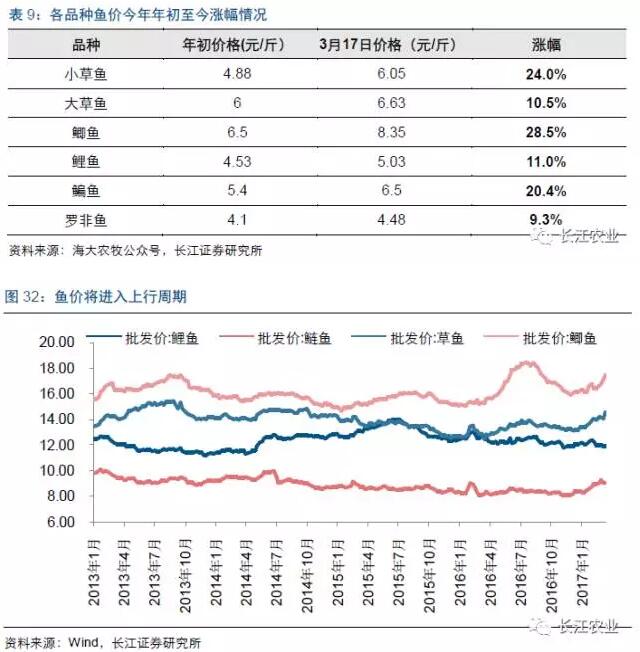 我们判断,今年水产料行业或迎来复苏。主要基于以下两点:1、受益于今年暖冬天气影响,预计今年投苗时间将较去年提前约1个月(去年由于寒潮原因集中投苗时间延至5月份),从而使得饲料投放时长有所增长,带动销量的上行;2、今年起鱼价开始大幅上行,主要原因在于去年7,8月份的洪灾使得今年整体的鱼供应量减少,年初至今平均鱼价已上涨17%,部分品种接近30%涨幅。在鱼价大幅上涨的背景下,水产料的投放量有望出现大幅提升,从历史数据来看,10年洪灾后11鱼价上涨,从而带动行业整体的需求量当年增长12%,达近10年来最高值,也进一步验证了在鱼价景气时期水产料需求量或出现大幅增长。