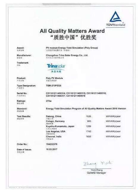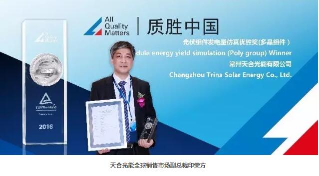 天合光能荣获2016年度TüV莱茵“质胜中国”光伏组件发电量仿真质胜奖