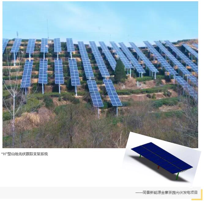 ①“H”型支架桩基跨度灵活,不用考虑结构的限制,适用于山地等复杂地形。②单一的推杆结构,无需主轴平行,推杆安装位置及长度可根据地形决定。③结构简单,易安装,无需大型机械设备,大大降低了施工成本。此支架系统成功应用于同景茶光互补模式。