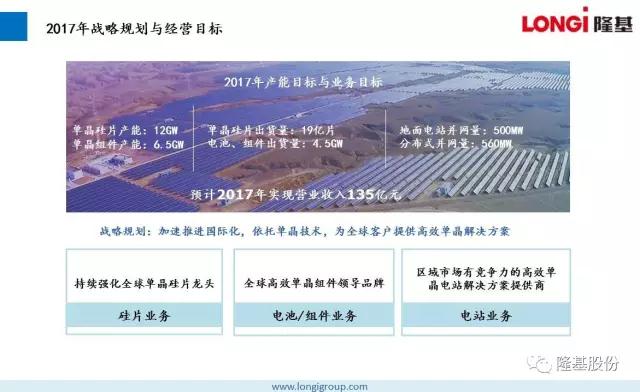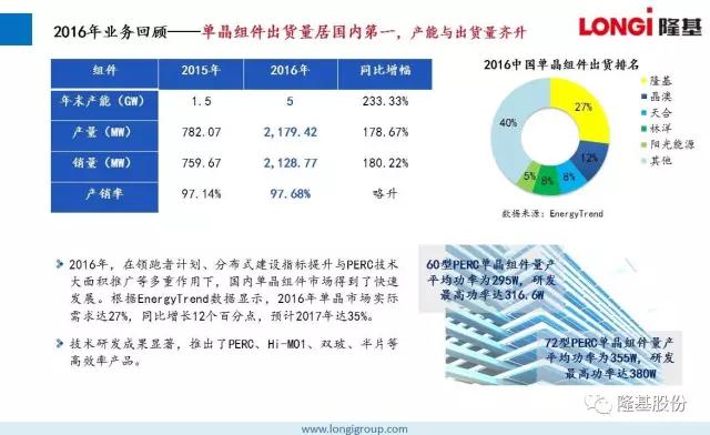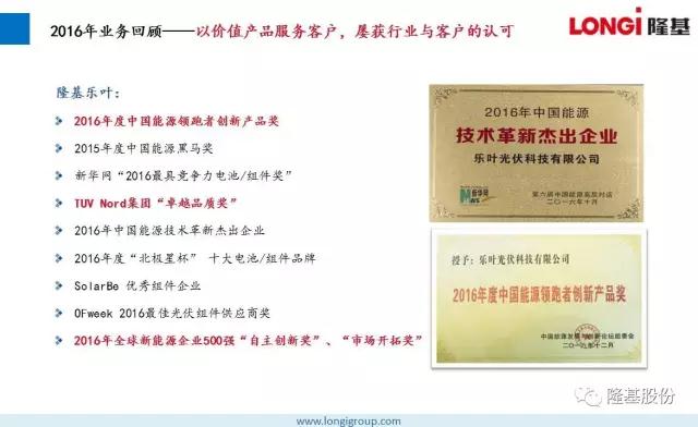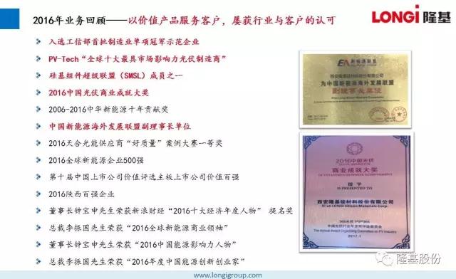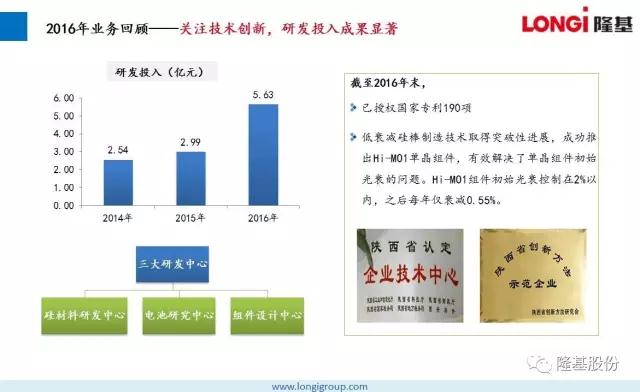 2016年,隆基股份始终专注于单晶技术路线,持续加大研发投入,秉持“可靠、增值、愉悦”的企业文化,为客户提供不断增值的产品,为员工创造愉悦的工作环境,低调稳健向前发展,做全球客户值得信赖的合作伙伴。在所有隆基人的不懈努力下,2016取得骄人业绩。