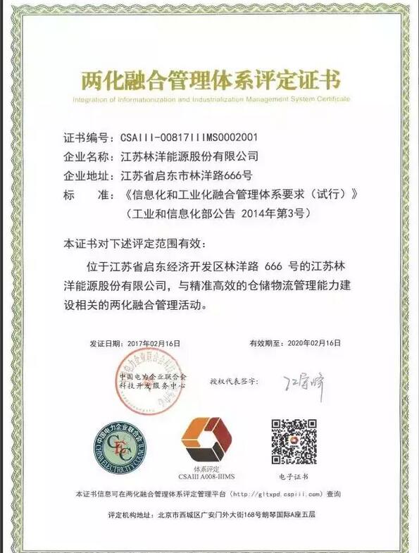2月16日,江苏林洋能源股份有限公司通过了工信部两化融合管理体系认定,荣获两化融合管理体系评定证书。此次两化融合管理体系评定通过,标志着林洋能源以信息化带动工业化,以工业化促进信息化,将持续打造与战略匹配的信息化环境下的新型能力,快速推进公司两化融合进程。