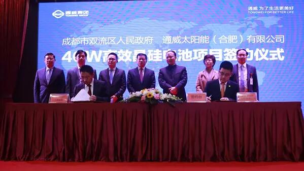 1月22日,成都市双流区政府、通威太阳能(合肥)有限公司4GW高效晶硅电池项目签约仪式在通威国际中心隆重举行,项目预计总投资约50亿元人民币。成都市双流区委书记周先毅,双流区委副书记、区长徐刚,双流区委常委、区总工会主席韩超,双流区副区长、西开区管委会党工委书记、主任曾虎,双流区副区长刘伟及区相关部门负责人出席签约仪式。十一届全国政协常委、通威集团董事局刘汉元主席,通威集团总裁禚玉娇、通威股份副董事长严虎,通威股份总裁郭异忠、通威集团监事会主席陈星宇、通威集团副总裁胡荣柱、通威太阳能(合肥、成都)有限公司董事长谢毅等通威高管出席签约仪式。