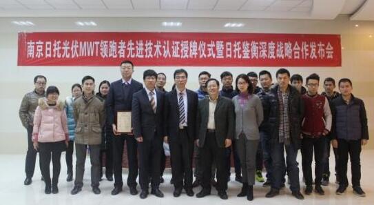 1月19日,在南京举办的“日托MWT领跑者先进技术认证授牌暨日托鉴衡深度战略合作签署仪式”上,南京日托光伏科技股份有限公司(以下简称“日托”)的MWT多晶电池和组件技术获得北京鉴衡认证中心(CGC)颁发的光伏组件“领跑者”先进技术产品认证证书,同时双方为加强在新能源方面的合作,签署了深度战略合作协议。