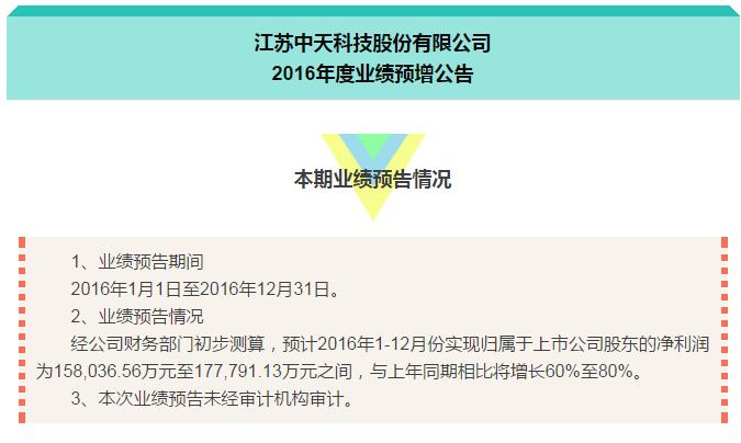 日前,江苏中天科技股份有限公司(中天科技,股票代码600522)发布《2016年度业绩预增公告》,预计2016年度归属于上市公司股东的净利润达15.8亿元—17.8亿元,同比将增长60%至80%。