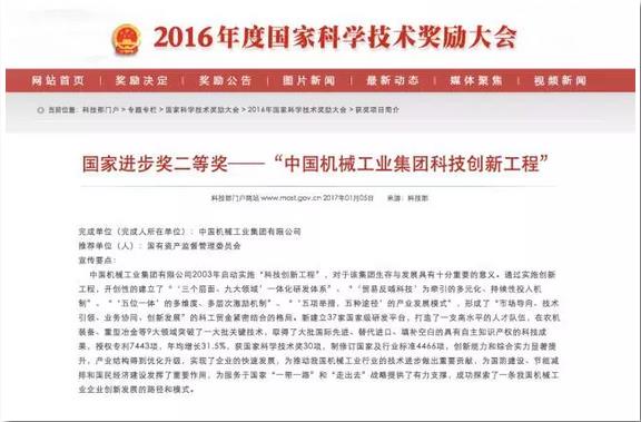 企业技术创新工程国家科技进步奖是国家为奖励在科技创新方面取得重大突破和卓越成效的企业而专门设立的奖种,“中国机械工业集团科技创新工程”获此殊荣标志着国机集团科技创新工作迈上新台阶。