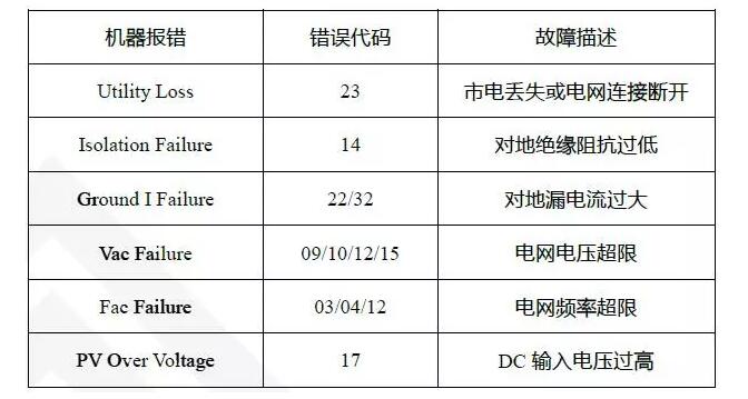 7.故障查询&判断功能—当光伏系统发生故障,逆变器记录的如下(部分)故障信息,可以准确的告诉您,光伏系统发生了什么状况,并快速排查,恢复系统发电。