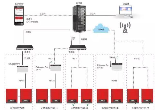 8.远程监控功能—逆变器可以利用自身可提供的(RS485/WiFi/GPRS)不同的通讯方式,帮助光伏系统实现远程监控,以满足业主对高效运维的需求。