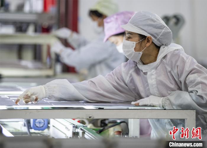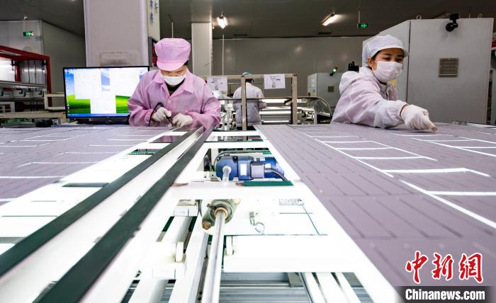3月2日,江西省新余市瑞安新能源公司员工在太阳能组件生产线上进行核验操作。