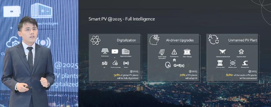 华为智能光伏业务总裁陈国光在致辞中提到,华为正在积极将5G、AI等新ICT技术与光伏进一步深度融合,打造更优LCOE、重构运维体验,给客户带来更多价值;并携手合作伙伴一起打造智能光伏的繁荣生态!