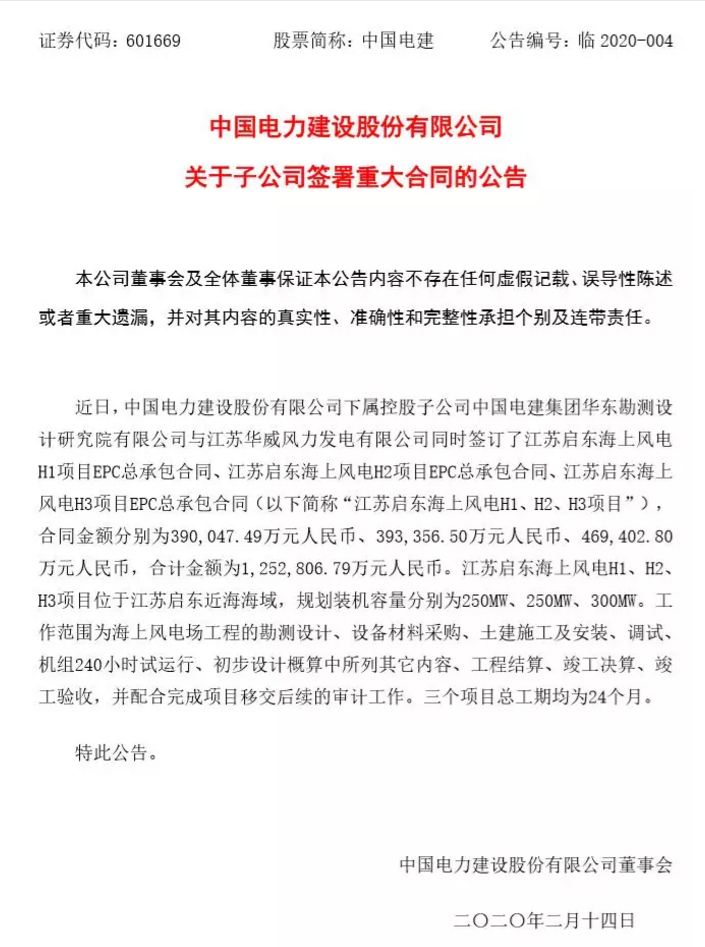 2月14日,中国电建发布公告称,公司下属控股子公司中国电建集团华东勘测设计研究院有限公司与江苏华威风力发电有限公司同时签订了江苏启东海上风电H1项目EPC总承包合同、江苏启东海上风电H2项目EPC总承包合同、江苏启东海上风电H3项目EPC总承包合同,合计金额为1,252,806.79万元人民币,三个项目总工期均为24个月。