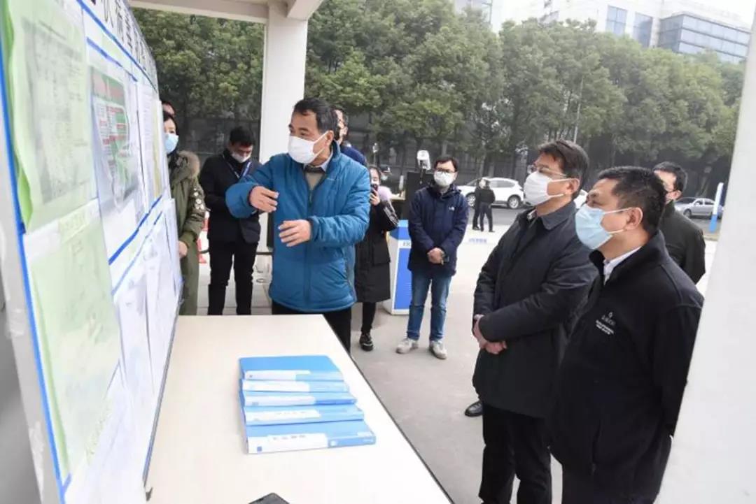 高纪凡(右一)陪同周斌(右二)听取疫情防控工作汇报