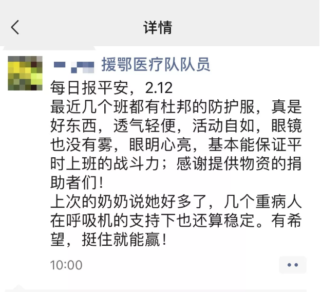 12日当天,我们也很意外很欣慰地看到了援鄂医疗队队员在收到防护服之后第一时间的反馈。这也让我们更加坚定初衷:尽我们所能,守护你们的安全!期待你们平安归来!
