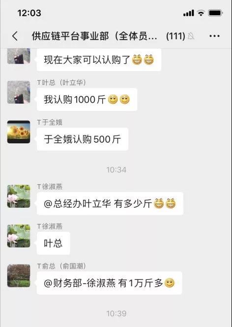 当了解到菜农诸昌忠一家的实际困难后,叶立华立即将这一急难情况上报给高层领导,很快,这场爱心接力在供应链平台事业部微信群扩散:“我认购100斤”“我认购500斤”“我认购1000斤”……大家你一言我一语在微信群里商量着献计献策,最终大家达成共识,组织起来开展“爱心助农”行动,让这场爱心接力的队伍不断扩大。