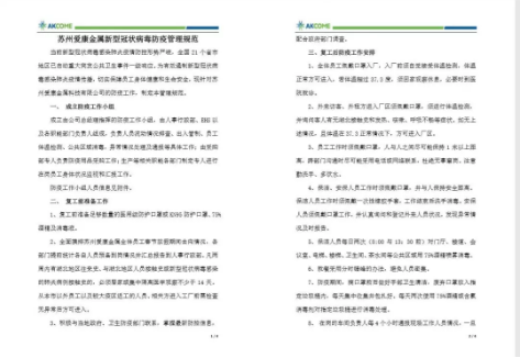2月11日是苏州爱康金属复工第一天,为了保障防疫期间的员工的健康安全,企业员工上下一心,从安环、行政部门,到技术、生产员工,到保洁、保安人员,都按照事先拟定的复工防疫方案,开始了严格且有条不紊的工作,以最有力最严厉的措施,确保返岗复工安全有序,助力生产持续稳定运行。
