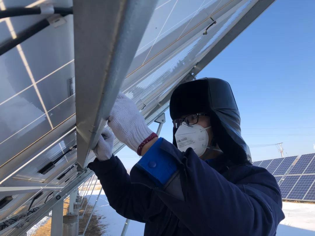 中广核吉林猛狮光伏电站的检修员谭鑫和田阳正在进行光伏区的设备特殊巡视,排查光伏板MC4连接插头的运行情况。疫情期间,猛狮电站将规定的每月一次的特殊巡检提升为每周一次,以确保设备的稳定运行。