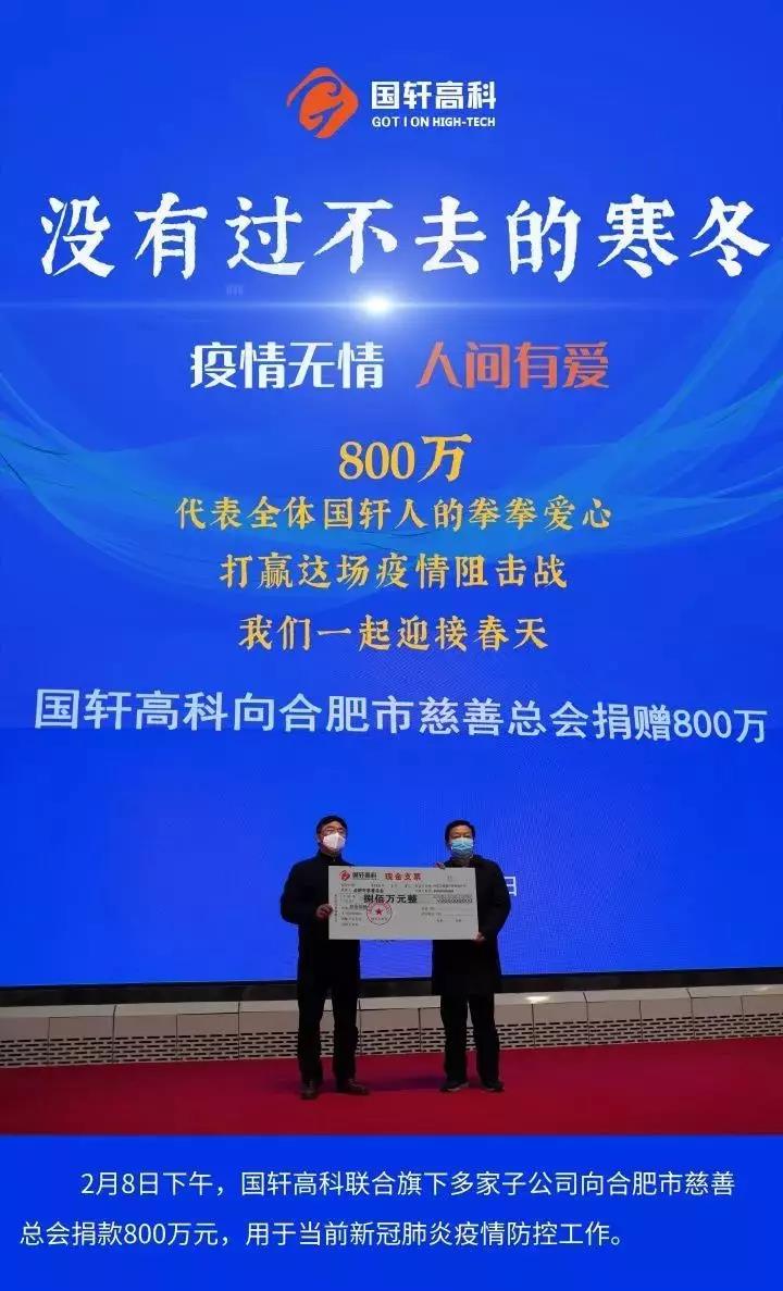 2月8日下午,国轩高科(002074)联合旗下多家子公司向合肥市慈善总会捐赠800万元,用于当前疫情防控工作。国轩高科董事长李缜表示,此次向合肥市慈善总会捐款,希望可以为打赢疫情阻击战尽一份绵薄之力。