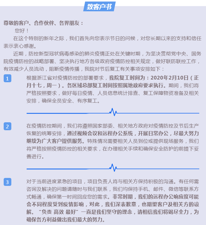 华东院致客户书:共克时艰、共渡难关
