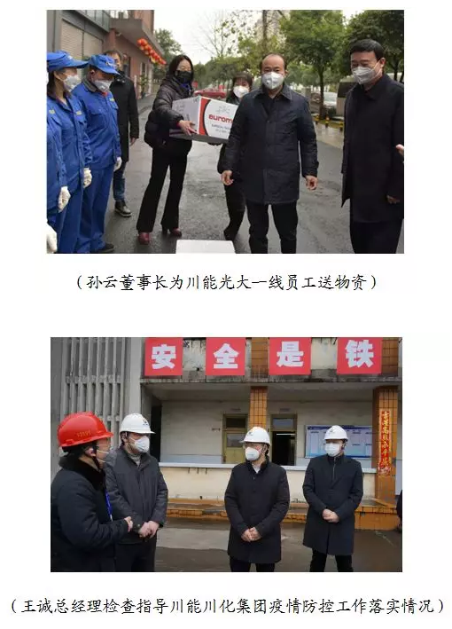 1月31日,四川能投党委书记、董事长孙云带队慰问春节期间坚守在工作一线的环卫员工,检查指导新型肺炎疫情防控环卫保障落实工作,并为他们送去4000支口罩和生活用品。2月2日,四川能投集团党委副书记、副董事长、总经理王诚前往川能川化集团检查、指导疫情防控保障落实工作,看望慰问一线员工,并协调解决了川化防控物资采购的困难。