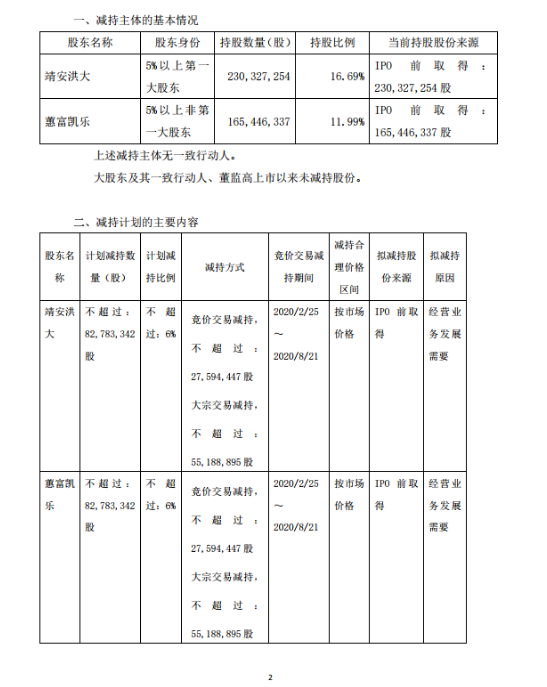 近日,明阳智慧能源集团股份公司发布股东减持股份计划公告,公告称靖安洪大、蕙富凯乐在本减持计划公开披 露之日起 15 个交易日后的 6 个月内(含 6 个月期满当日),通过集合 竞价及大宗交易方式分别减持股份不超过 82,783,342 股(占公司总股 本比例 6%)。其中通过集中竞价方式进行减持的,任意连续 90 个自然 日内减持的股份总数不超过 13,797,223 股(占公司总股本 1%);通过 大宗交易方式进行减持的,任意连续 90 个自然日内减持的股份总数不 超过 27,594,447 股(占公司总股本 2%)。拟通过协议转让方式减持股 份数量将遵循法律法规规范性文件的规定。若减持期间公司有送股、 资本公积金转增股本等股份变动事项,减持股份数量进行相应调整。