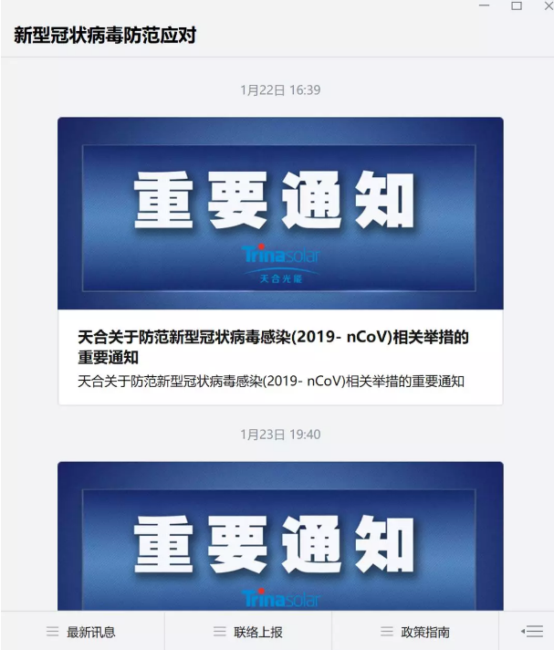 疫情突发且来势迅猛,为了让天合光能全国乃至全球一万多名员工及时了解公司抗击疫情措施以及经营工作的安排,1月22日,“新型冠状病毒防范应对”栏目在企业微信上线。专栏每日更新、实时发布,截至目前已发布近30条重要通知和指导文案,涵盖抗击病毒科普知识、常州及其他外工厂疫情应对通告、公司应对疫情工作的措施和工作进展等。