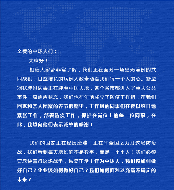 2.在确保人身安全的前提下,我们要继续兑现“客户信赖”的企业愿景,继续承担让平台永恒的责任,用契约精神面对客户,尊重个人对组织的契约,也尊重企业对客户的契约,尊重“法理情”。我们更多的客户集中在海外,在这样的特殊时期,我们更将把“法”作为我们价值实现的背景,与客户共同进退。在这样的特殊时期,我们要学会与疫情下的不确定性共处。在现今情况下,我们的工作开展会比平时变得更加复杂和困难,这个时候需要每一位中环人更大地发挥主观能动性,主动服务客户、主动承担工作、主动担当负责、主动发起任务、主动协同伙伴。