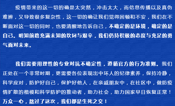 1.响应国家号召,严格遵守国家及各地区出台的各项规定、制度。不心存侥幸,不走亲访友,不搞聚会,不参加集体活动,最小化与人群接触范围;不私自突破疫区限制;自己或家人有症状及时就医,不应怕被隔离而瞒报病情。保证自己和家人不成为病毒传播者!面对疫情,我们要承担的基本社会责任除了保护好自己和我们的家人外,请务必不造谣、不信谣、不传谣,不做伤害公众利益的事情。如果你或者你的家人出现身体不适的情况,先不要恐慌,请通过公开信息先对自己的病情做一个基本判断,然后视情况自我隔离或及时就医,同时及时与你的上级联系,并上报给各公司的防控小组。