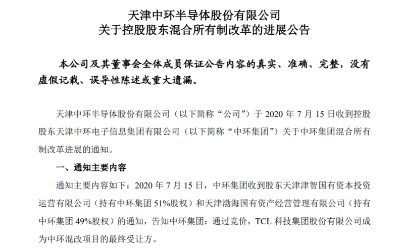 2020年7月15日,据获悉,中环股份发布公告,母公司中环集团收到股东天津津智国有资本投资运营有限公司(持有中环集团 51%股权)和天津渤海国有资产经营管理有限公司(持有中环集团 49%股权)的通知,告知中环集团:通过竞价,TCL科技集团股份有限公司成为中环混改项目的最终受让方。