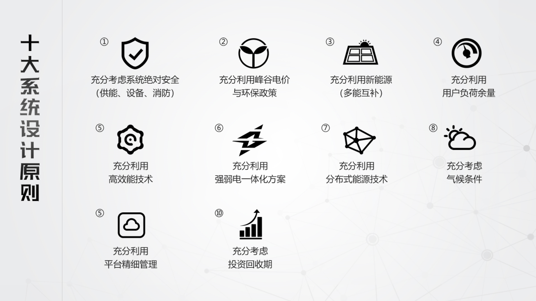 全生命周期服务,源于大型公共建筑对能源设备、能源使用及能效管控系统全程智慧管理的硬性需求。正泰能效科技,将客户的需求作为对自己的要求,为达到“全程能效”目的,在规划阶段便采用了十大系统设计原则。