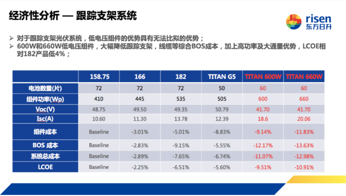 低电压、高功率的创新型设计,在降低BOS成本方面的表现令人惊艳。刘亚锋介绍道,“事实上,开路电压越低,BOS成本越低,在组件效率不变的情况下,开压每降低2V,对应的BOS成本降低约0.5分钱。600w低电压组件相对166的440w组件可降低系统BOS成本最大达到0.2元/w。