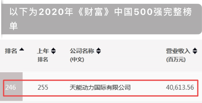 今天,《财富》发布2020年中国500强排行榜,天能以营业收入406.14亿元,位居榜单第246位,较上一年度排名跃升9位,在电池行业中排名第一。这是天能连续8年入围《财富》中国500强榜单。